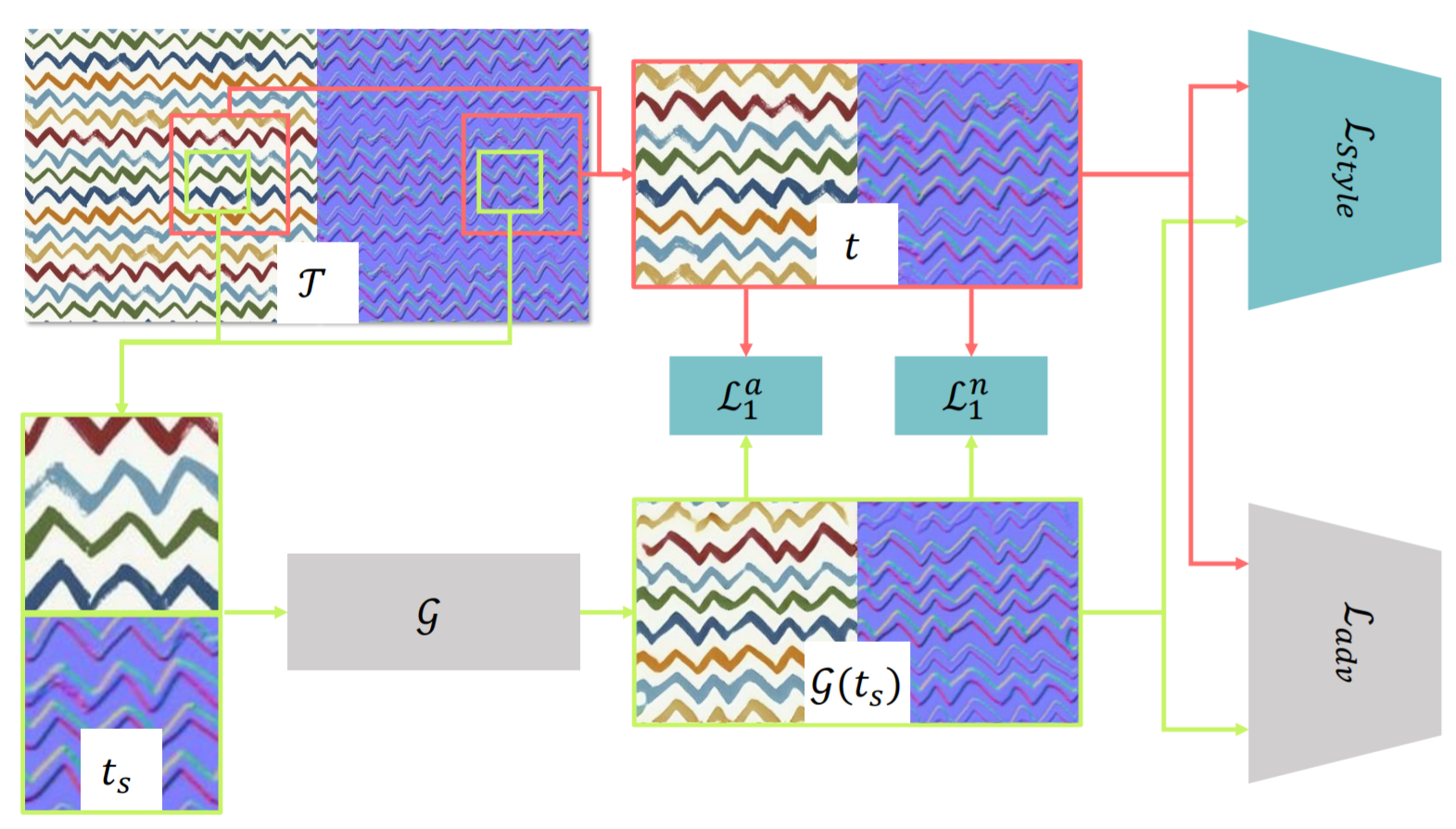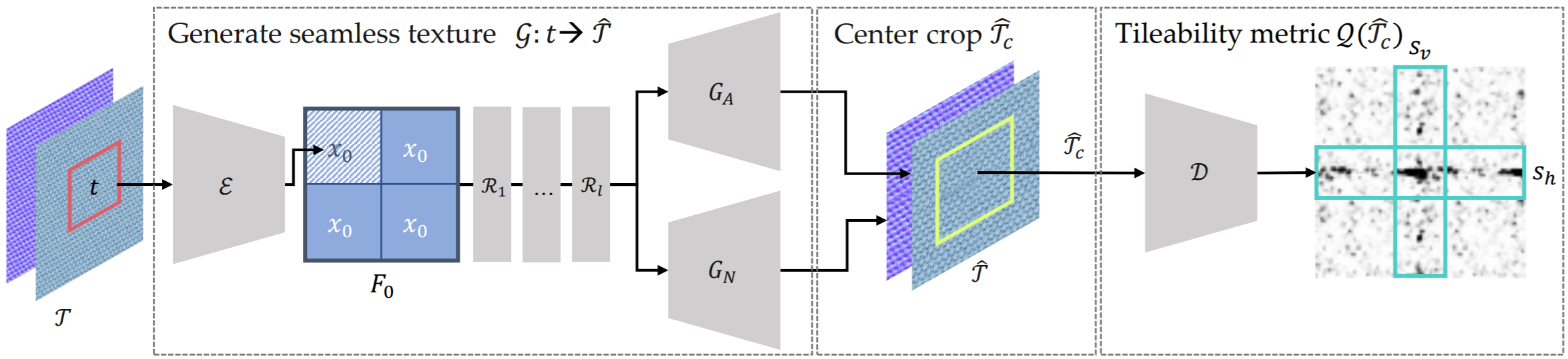 Once the GAN has been fully trained, which, thanks to different training optimizations, takes one order of magnitude less time than previous methods, we can generate tileable texture stacks. To achieve this, we feed the generator with an input crop of the original texture, obtain a latent space, which we tile horizontally and vertically. This generates a latent field, which is fed to the rest of our generator. The generated output contains 4 copies of a generated texture, with seamless borders. Cropping the central area, we obtain a single of those copies, which is the output tileable texture stack. The discriminator provides pixel-wise quality estimations of the quality of the generated textures, which we use as guidance for a novel sampling algorithm. This sampling can generate multiple tileable texture stacks from the same inputs, while being able to discard low-quality samples.