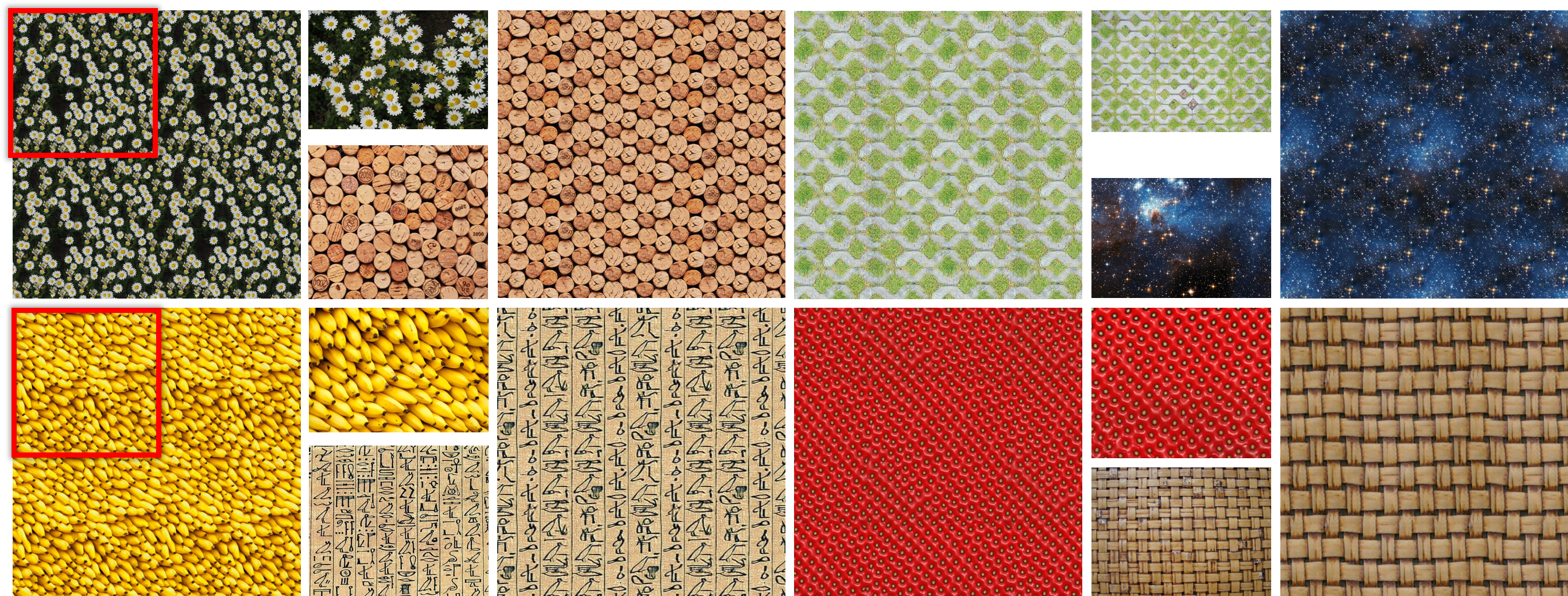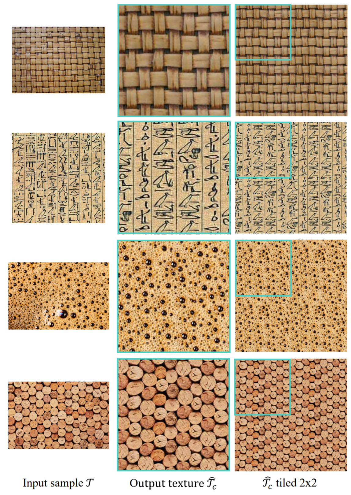 Our framework works for textures of multiple levels of regularity, stochasticity and semantics, surpassing previous methods on different quantitative metrics.